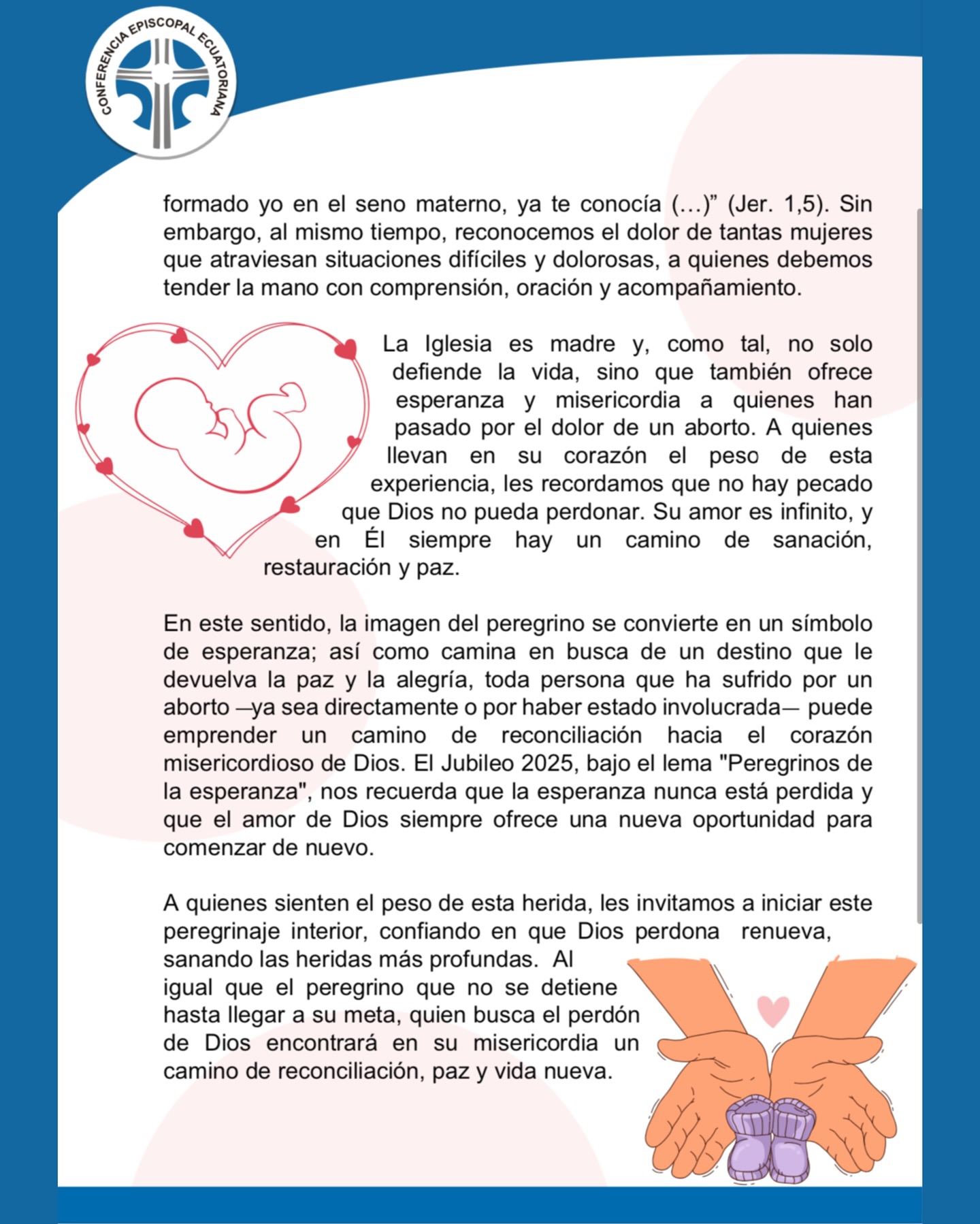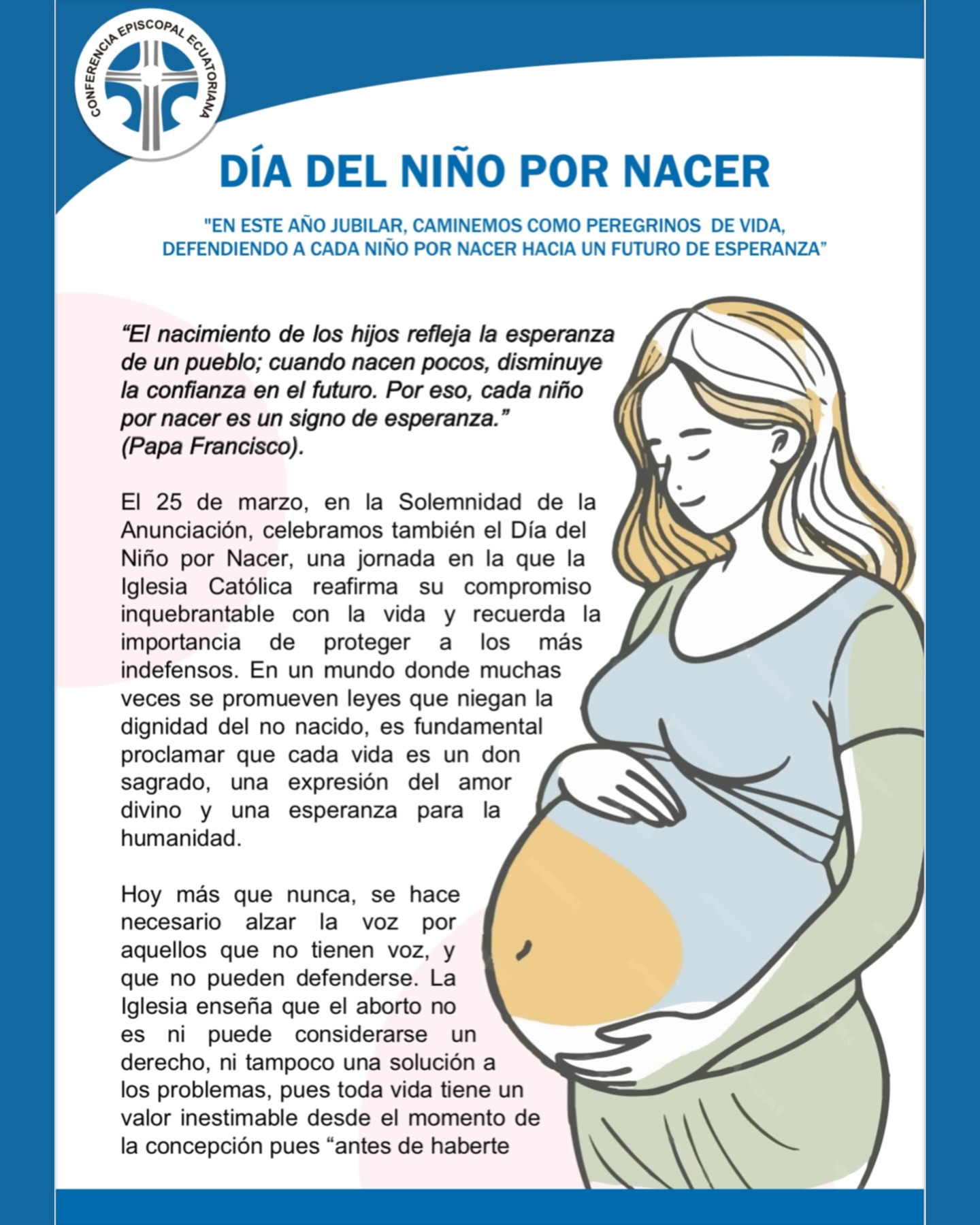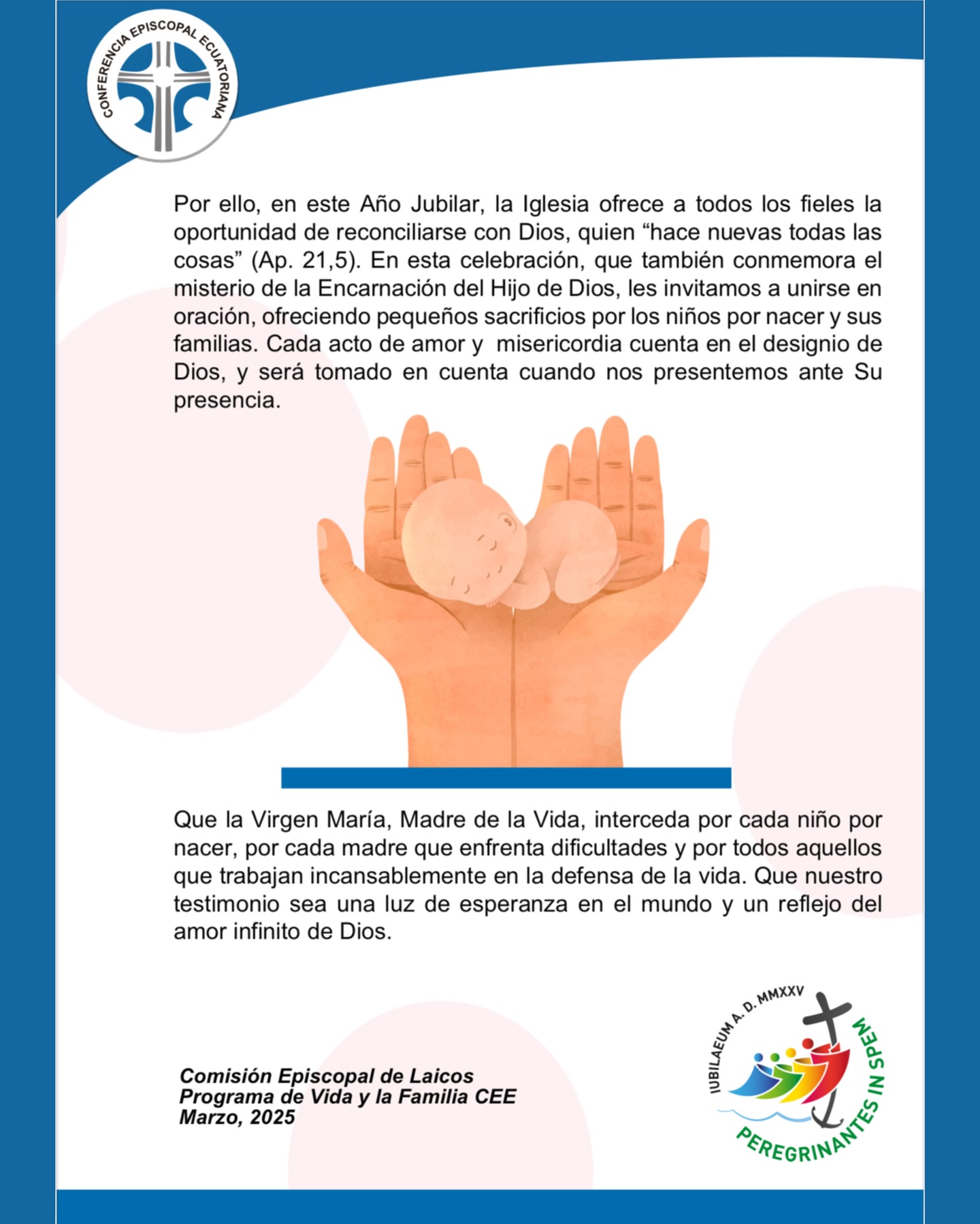 Con el titulo “En este año jubilar, caminemos como peregrinos de vida, defendiendo a cada niño por nacer hacia un futuro de esperanza”, la Iglesia ecuatoriana reafirma su misión de defender la vida desde la concepción y de acompañar a las familias en este camino de esperanza y fe.