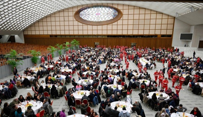 ”En la segunda, un mes después, en la Jornada Mundial de los Pobres, en el mismo sitio, en las mismas mesas, una multitud de hombres y mujeres en situación de calle almorzando junto al Papa.