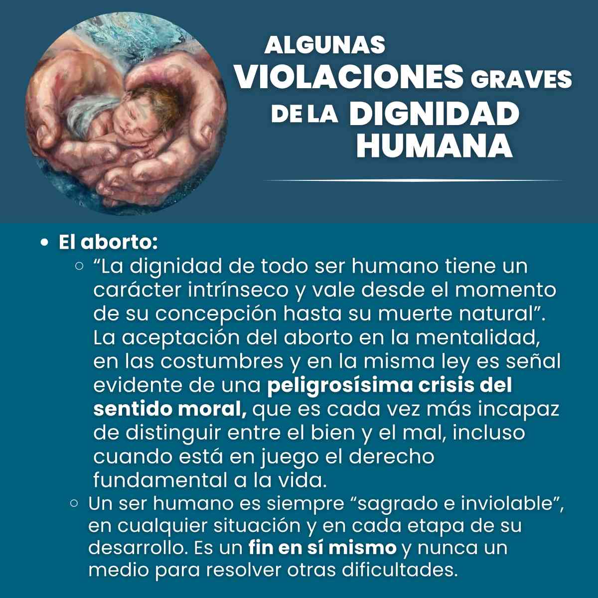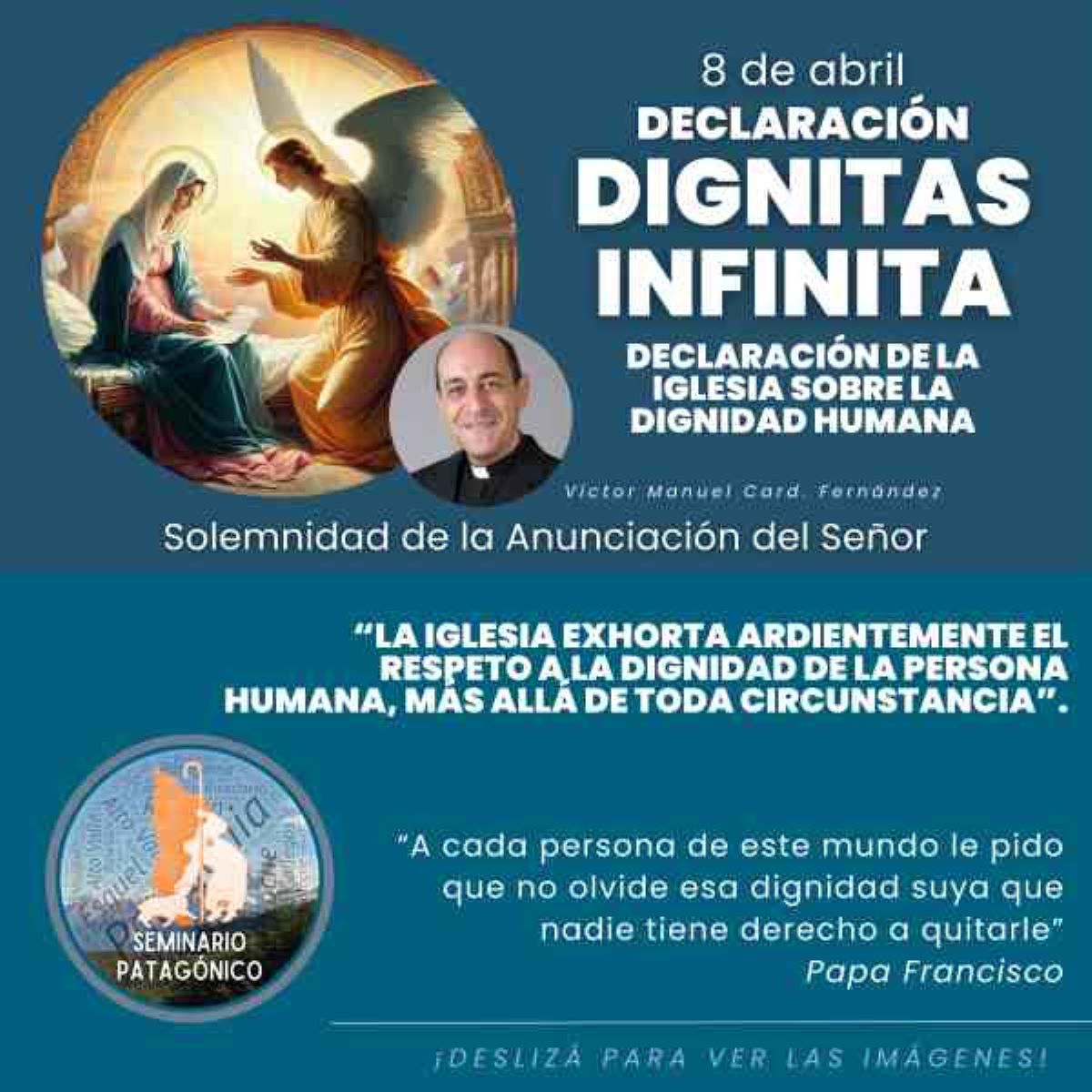 RESPUESTA: Coincidiendo con la Solemnidad de la Anunciación del Señor, el pasado 8 de abril, notamos la oportunidad de poder integrar la Declaración Dignitas Infinita a la fecha litúrgica, las imágenes del ángel anunciándole a María sobre el niño que iba a llevar en su vientre nos hizo preguntarnos: ¿no es este el sueño de Dios en todos los niños y niñas en los vientres de sus madres? Pero para que hoy nos podamos preguntar esto, hubo diversos derechos que resguardaron nuestra vida hasta el día de hoy. Y así se nos ocurrió el poder sintetizar el mensaje de Dignitas Infinita, resaltando los enunciados que más nos llamaron la atención, qué creíamos que respondían mejor y de forma clara a las dudas de los cristianos sobre qué pensamos. Sin perder el estilo propio que venimos trabajando este último tiempo como Equipo, quisimos sumar a la Solemnidad que celebrábamos aquel día este documento que recién acababa de salir.