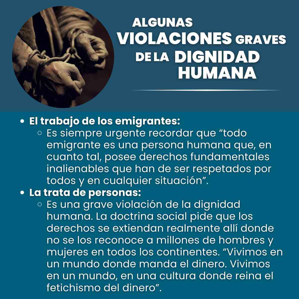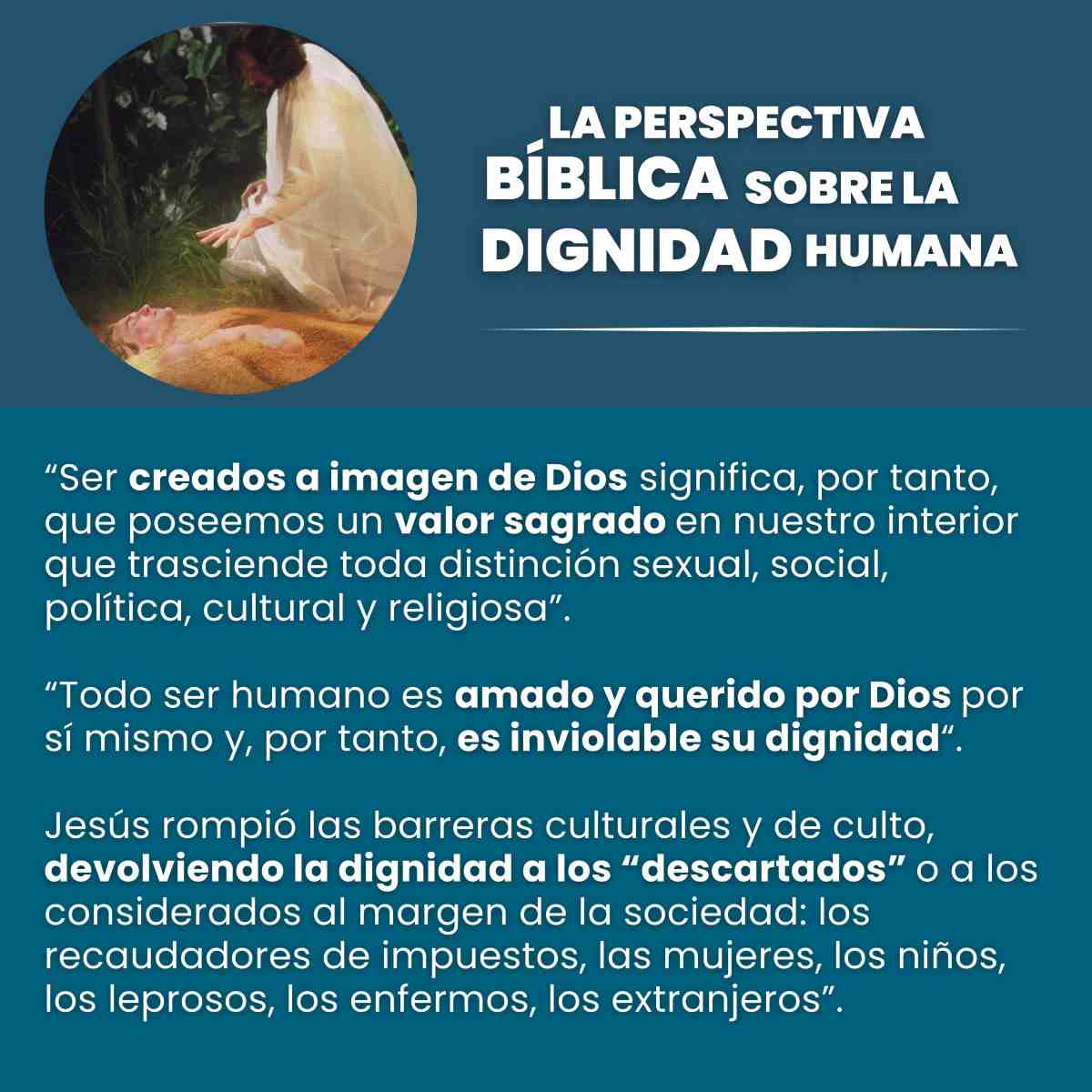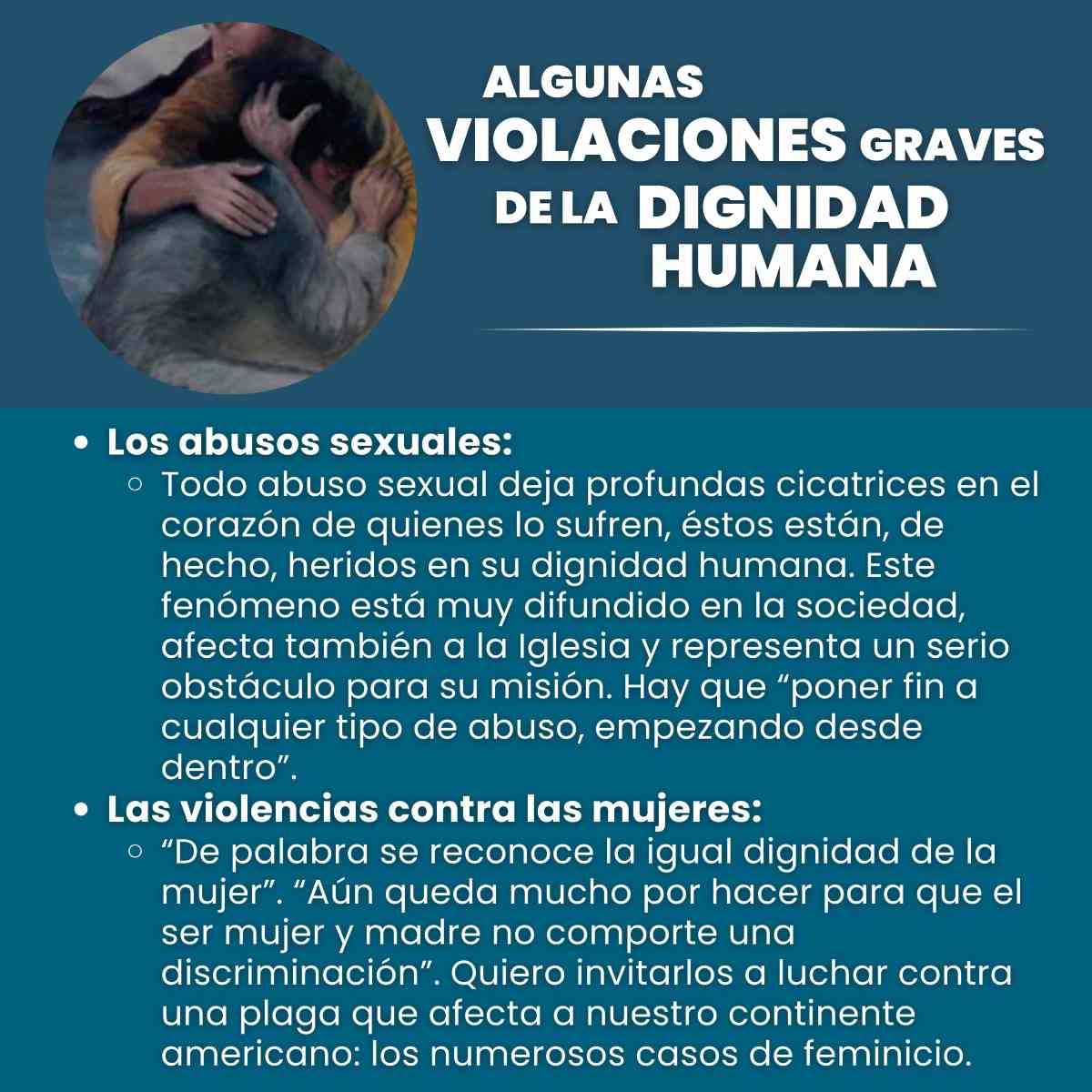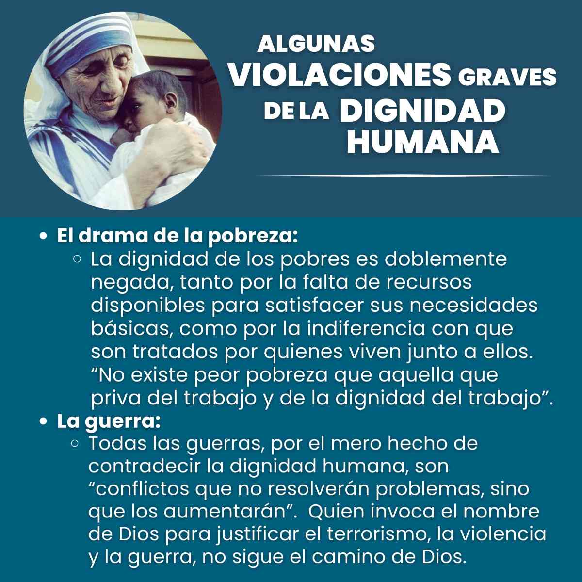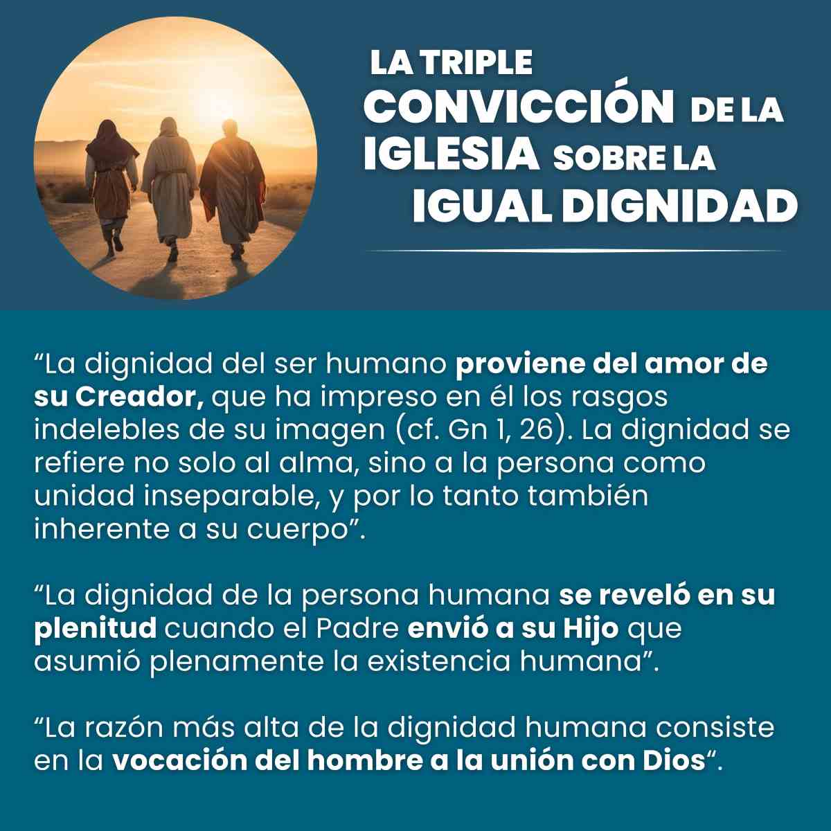 R: ¡Sí! Comenzamos por trabajar sobre el texto publicado en la página del Vaticano, lo pasamos a un documento Word, resaltamos aquellas frases que nos parecían que resumían precisamente el tema del que se hablaba. Fuimos armando cada flyer, tratando de seguir la sucesión de títulos y subtítulos de la que se compone Dignitas Infinita, y pensamos en imágenes y fotografías que mejor se identifiquen con el tema que se estaba desarrollando. Nos pareció conveniente poder finalizar todo el resumen con conclusiones que no son las del documento original, pero que sí destacan el pensamiento central de la Iglesia sobre la “igual dignidad de todos los seres humanos” y la importancia eclesial de la dignidad humana en el Concilio Vaticano II.