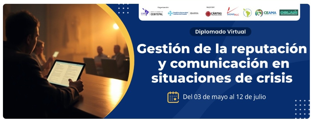 El Consejo Episcopal Latinoamericano y Caribeño (Celam), a través del Centro de Cebitepal, y la Pontificia Universidad Católica del Ecuador sede Ibarra, en conjunto con diversas instituciones aliadas, lanzan el Diplomado en Gestión de Reputación y Comunicación en Situaciones de Crisis. Programa académico, completamente virtual, que se llevará a cabo del 3 de mayo al 12 de julio y está dirigido a obispos, presbíteros, religiosos y laicos responsables de comunicación en el ámbito eclesial.