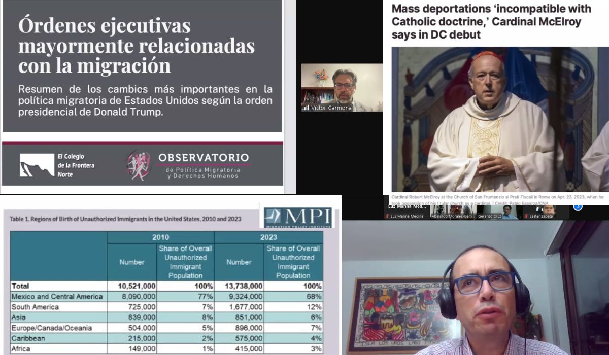 El primero en intervenir fue el Doctor Víctor Carmona, profesor en la Universidad de San Diego, México, quien inició destacando las duras medidas políticas migratorias implementadas en los Estados Unidos. Expuso cómo las cinco órdenes ejecutivas firmadas por el presidente Donald Trump están afectando la seguridad y estabilidad de los inmigrantes, de manera especial de mexicanos y centroamericanos. De acuerdo a Carmona, estas medias buscan generar un «ambiente inhóspito» para los migrantes, lo que ha derivado en deportaciones masivas y el uso de estrategias de miedo para disuadir la inmigración irregular.