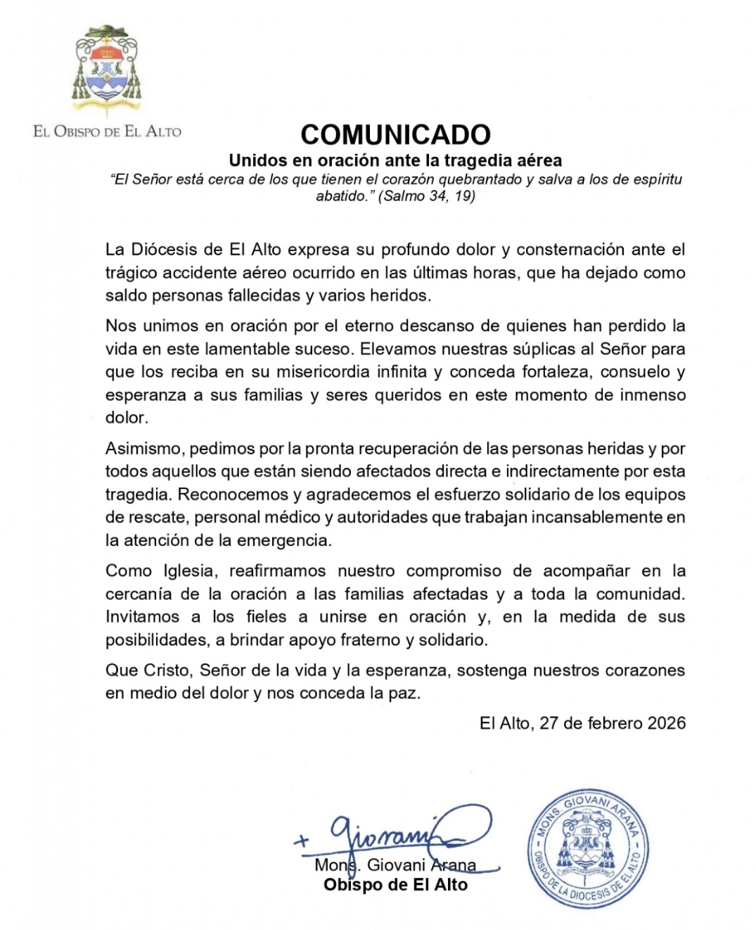 En un comunicado fechado el 27 de febrero de 2026, el obispo Giovani Arana manifestó la consternación de la Iglesia local ante el siniestro aéreo que ha conmocionado a esta ciudad vecina de La Paz y a toda Bolivia.