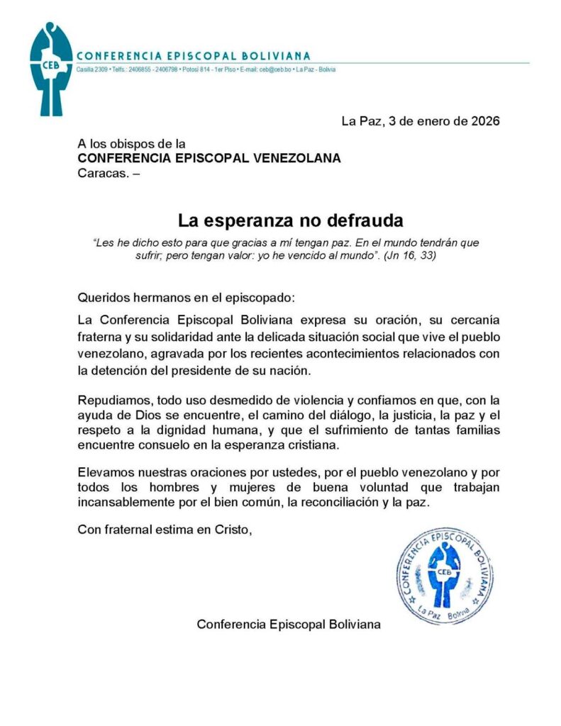 La carta concluye con una expresión de fraternidad en Cristo, asegurando el acompañamiento de la Iglesia boliviana de manera espiritual y pastoralmente al pueblo venezolano en este momento crítico de su historia: “Con fraternal estima en Cristo”, firman los obispos de la Conferencia Episcopal Boliviana.