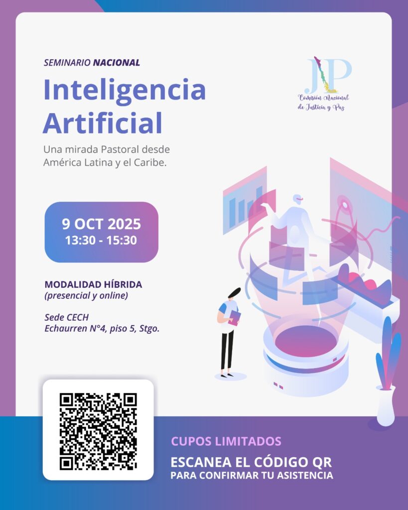 La Comisión Justicia y Paz de la Conferencia Episcopal de Chile anunció la realización del seminario nacional “La Inteligencia Artificial, una mirada pastoral desde América Latina y el Caribe”, que se llevará a cabo el próximo 9 de octubre en la sede de la Conferencia Episcopal de Chile, en modalidad híbrida.