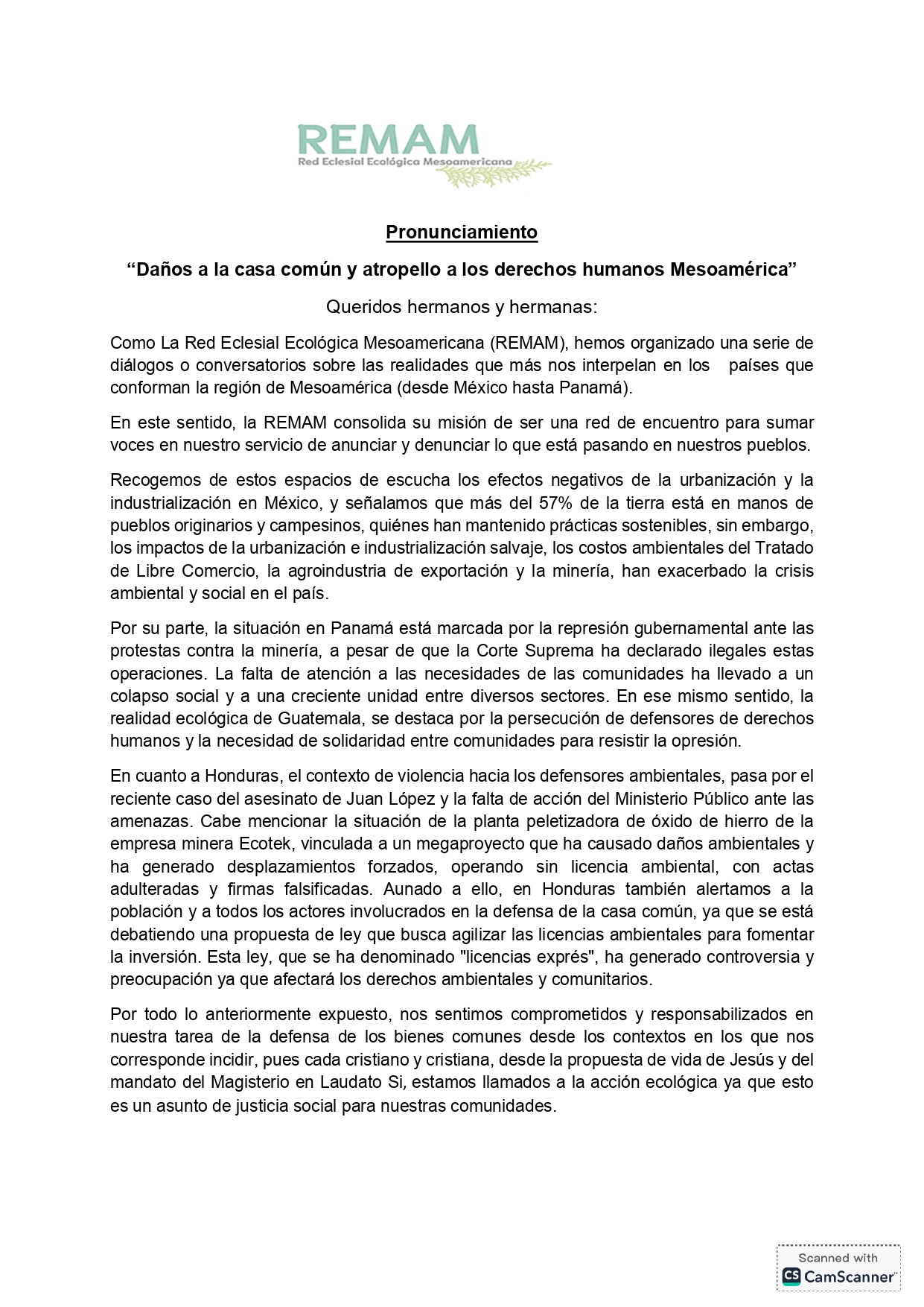 La Red Eclesial Ecológica Mesoamericana (Remam) emitió un pronunciamiento en el que denuncia los graves daños ambientales y las constantes violaciones a los derechos humanos que se registran en diversos países de la región mesoamericana.