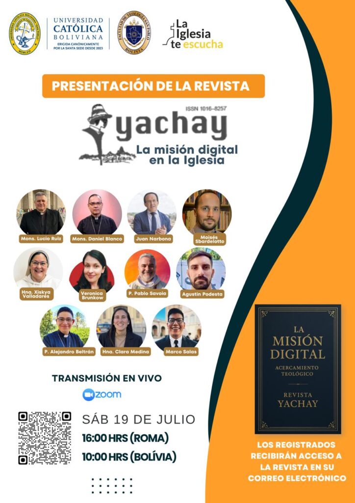 R.: El próximo 19 de julio, a las 16:00 hrs (Roma) y 10:00 hrs (Bolivia), se llevará a cabo la presentación oficial de este número de la revista Yachay. La transmisión será en vivo a través de los canales oficiales de la Universidad Católica Boliviana.